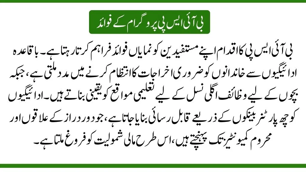 The BISP initiative continues to provide significant benefits to its beneficiaries. Regular payments help families manage essential expenses, while scholarships for children ensure educational opportunities for the next generation. Payments are made accessible through six partner banks, reaching remote areas and underserved communities, thereby promoting financial inclusion.